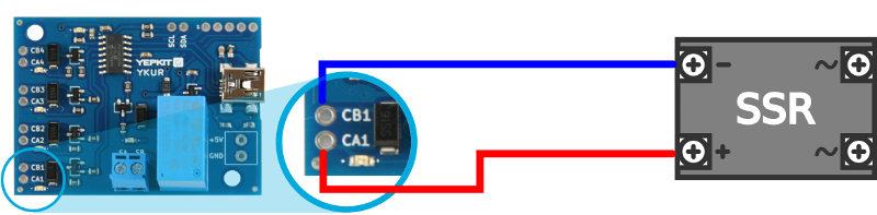 In a mechanical relay the polarity of the coil control connections does not matter, but in a SSR the polarity must be respected. The (+) control terminal of the SSR must be connected to the high-side pin of the YKUR external relay driver port, and the (-) control terminal of the SSR must be connected to the low-side pin of the YKUR external external relay driver port. The pins labeled CAx are high-side and pins labeled CBx are low-side. Use the figure above as reference for identifying the high-side and low-side pins of the external relay driver ports of YKUR board.