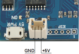 To connect the board, start by powering it up by supplying 5V to one of it's input terminals. You can use the Micro USB terminal (5V PWR) or the alternative connector respecting the polarity as indicated in the bellow picture.