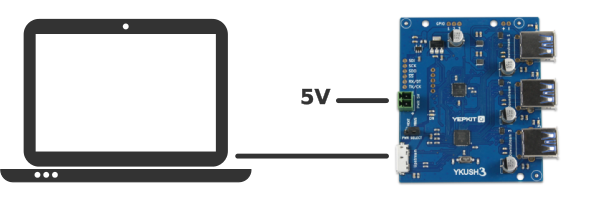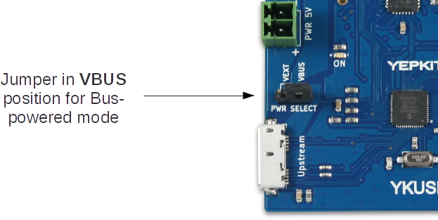 If only low power devices will be connected to YKUSH 3, the Bus-powered mode can be used. To connect the board using the Bus-powered mode start by ensuring that the on-board jumper is in the VBUS position, then connect the upstream port (the Micro USB 3.0 terminal) to the host USB port (eg, the USB port of a PC). And that's it.