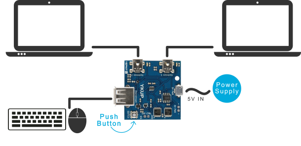 For example, if you want to use the same keyboard with two PCs, without the need to physically switch the USB cable connection between them, YKUP is for you. With YKUP you can switch the keyboard from one PC to the other just by pressing a push-button. Alternatively a digital control signal (e.g., from a GPIO) can be used to trigger the switch.
