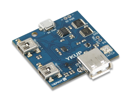 YKUP is a USB upstream switch that allows two hosts to share the same USB device. The user switches the device between the two hosts simply by pressing the on-board push-button.