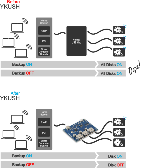 With YKUSH the home server is able to switch ON and OFF the USB external HDD drives, effectively powering them ON/OFF. This way it is ensured that the drives are only powered when they are being used to backup data enabling a higher longevity of the drives and lower power consumption.